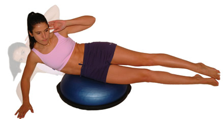 Support the weight of your head with your lower hand, or rest your hand on the floor to aid stability, whilst the elbow of the top arm faces upwards. Begin the exercise with your side resting relaxed along the Bosu.