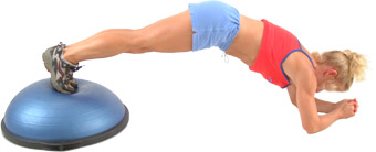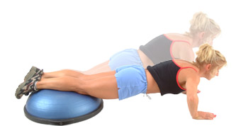 Only suitable for intermediates / advanced. Rest your toes (harder) / shins on the centerline of the Bosu, placing your hands out into a normal press-up position, keeping your legs, spine and neck in a straight line.