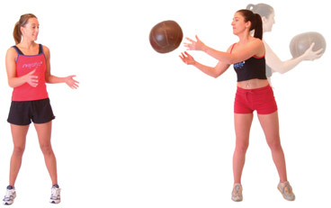 Aim to pass the ball back to Partner 1 in an underarm action, where the ball begins to drop at the catching point, throwing a heavy ball to be caught, will place excessive strain on the body, especially in a twisted position.
