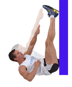 Aim to take your right hand up and across to touch the left foot, and vice versa, in a smooth controlled movement, that avoids any jerking actions in the final phase. (You don't have to touch your toes - this is just the direction of movement).