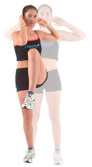Begin the movement in a standing position, with your feet shoulder width apart, resting your hands on your ears, with your elbows pointing out to your sides.