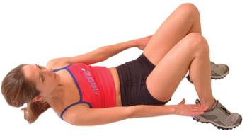 With your arms off the floor down by your sides, use your left oblique muscles to twist from your waist, taking your left hand to your left foot, repeating again on the other side, by using your right oblique muscles.