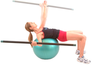 Rest your shoulders and upper back on a suitable sized Swiss ball, keeping both feet flat on the floor, shoulder width apart.
