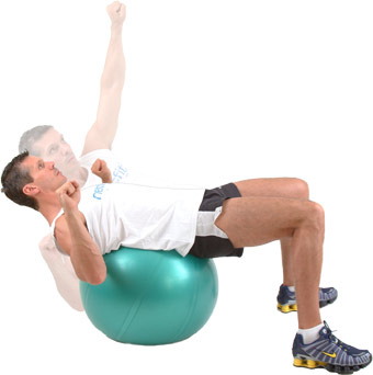 Focus on keeping your lower back and buttocks on the ball throughout the exercise, as you slowly lift one shoulder 6 - 10 inches higher, taking the arm of that side straight up, whilst allowing the elbow on the other side to come down.