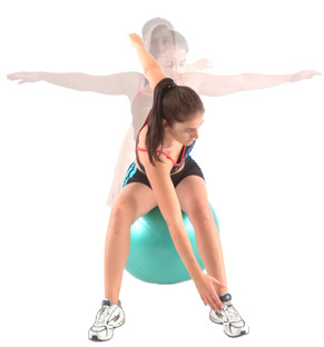 Begin in an upright-seated position, on the center of the Swiss Ball, with both arms extended out to your sides.