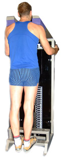 Set the machine up so that when you stand straight with the balls of your feet are on the platform, you have the shoulder weight cushions comfortably placed on your shoulders, - avoid being bent up, or straining to reach the supports.