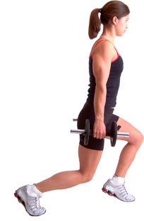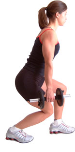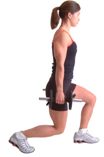 Adopt a squatted lunge position, front leg bent at 90 degrees - rear leg extended back 18 inches, keeping your feet shoulder width apart to aid balance, with both heels on the floor.