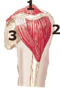 The main muscle is the deltoid 2, which originates along your clavicle (collar bone 1) and scapula (shoulder blade 3). The muscle inserts onto the outer side of the upper arm, about half way down the bone.