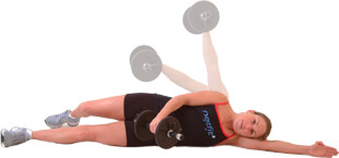 Lie on your side on the floor, with your upper leg extended behind, holding a suitably weighted dumbbell in your upper arm, having the weight on the floor close to your body, resting your head on your lower arm.