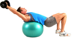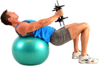 Lay on either your front or back on an appropriate sized Swiss Ball, holding suitable dumbbells in each hand by your hips.