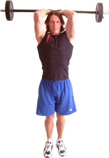 Stand straight with suitably weighted barbell overhead, hands placed centrally 6 – 8 inches apart. If unsure about what weight to use, always start light and adjust slowly but positively, using a weight that is to heavy will cause you difficulty in performing this exercise correctly.