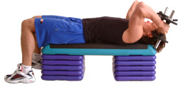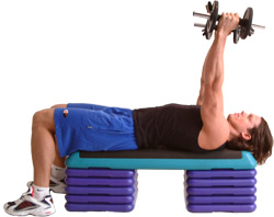 Lie face up on a flat bench, holding a suitably weighted dumbbell in both hands, with your arms straight, the weights directly above your shoulders.