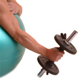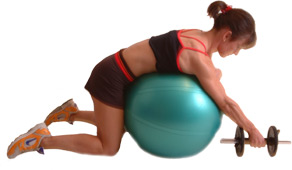 Keeping your tricep (back of your arm) in contact with the Swiss Ball, smoothly lower and lift the weight, keeping your palms facing each other (two dumbbells) - thumbs on top throughout.