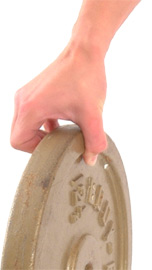 Grasp a weighted plate around the ridge, keeping your thumb on the inside, with your finger tips on the outer side.