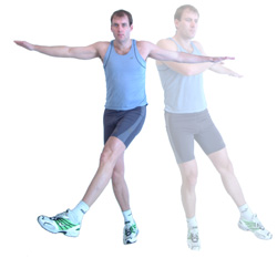 Stand tall with your feet shoulder width apart, having both arms extended out to one side of your body, at about shoulder height, whilst also having the one leg lifted up and extended across your body.