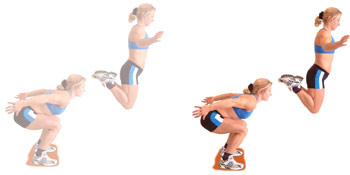 Keeping your feet and knees shoulder width apart throughout the exercise, swing your arms back, and then upwards as you aim to get both vertical height, bringing your feet close to your buttocks, and also forward distance, landing on both feet.