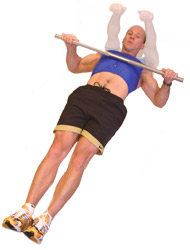 To work the back muscles, grasp the bar with your arms wide, having your thumbs curled under the bar, fingers over the top, keeping a straight line through your body with your legs and arms straight. Grasping the bar with an underarm grasp, hands shoulder or close grip will also help to work the biceps and tricep muscles.