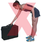Correct Lifting Stand as close as possible to the object to be lifted, bending the legs, whilst holding the object securely ideally using carrying handles. Keep your back and arm straight throughout the lift, slowly straighten your legs to lift the object in a steady movement, avoiding any jerking. Take small movements with your feet when walking, especially around corners. Avoid lifting any object, which requires you to bend or twist during the movement, for example luggage conveyor belts. If carrying numerous bags, (shopping) aim to spread the weight each side evenly to balance out the strain on the lower back. |