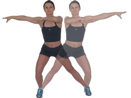Side Bend Arms Parallel to Floor Bend the knee forward on the extended arm side, keeping the other leg straight, transferring your body weight to the bent leg side. Transfer your bodyweight to your opposite side by straightening your bent leg as you bend your straight leg. At the same time, swing the arms around to help transfer your weight. Keep your back straight throughout, repeating 20 - 40 times in 30 - 60 seconds. |