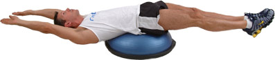 From the same starting position, extend both arms and legs out slowly together. Concentrate on contracting the abdominal group muscles for stability, whilst keeping your lower (lumbar) back in contact with the Bosu at all times.