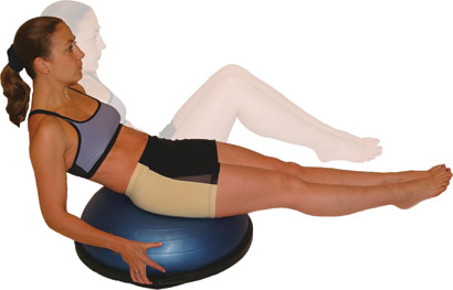 Bend your legs to 90 degrees, keeping your heels off the floor throughout the exercise; however aim to also keep them off the Bosu in order to keep the abdominal muscles contracted.