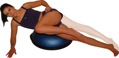 Lay the on the central part of the Bosu, aiming to lie on your side, keeping both feet off the floor, however using your lower arm for balance, by resting your forearm on the floor.
