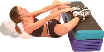 Lie on your back with both the soles of your feet touching together, whilst being raised on a step box.