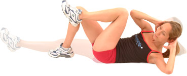 Exhale and lift your shoulders up off the floor, with your hands clasped behind your head, supporting but not pulling your head.