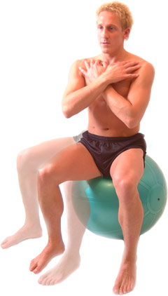 Sit centrally on a correct sized Swiss ball; with both feet flat on the floor, knees shoulder width apart.