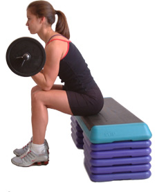 Grasp the bar with an underarm grip (palms-up) with your hands 6 - 10 inches apart. Lift and lower the weight in a smooth motion, keeping your elbows in contact with your thighs, taking the bar through a full range of movement.