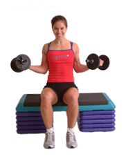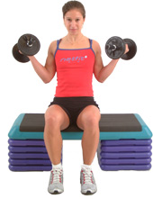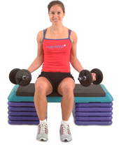 Sit on a bench or a suitable chair, ideally with back support, having the dumbbells down by your sides, palms i facing forwards.