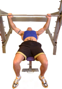 With your arms locked out in the starting phase, smoothly lower the bar down towards your chest, just below your nipples, keeping your elbows wide. Aim with each lift to get a full range of movement by actually touching or getting close to the chest – if you can't get close, then your weight is to heavy – focus on good technique with the weight you can lift – let those who do heavier weights with poor technique risk injury.