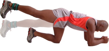 Rest on your forearms and one knee, keeping the other leg straight a few inches off the floor, with a suitable ankle weight attached, (you don't need to much weight to make this exercise effective).