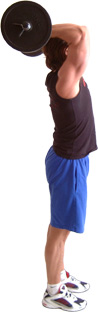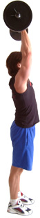 Stand straight with suitably weighted barbell overhead, hands placed centrally 6 – 8 inches apart. If unsure about what weight to use, always start light and adjust slowly but positively, using a weight that is to heavy will cause you difficulty in performing this exercise correctly.