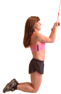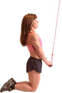 Kneel down facing the cable machine, with a small bar attached to a high pulley cable, having your hands close together – 4 to 6 inches apart, palms down, keeping your upper arms close to your head.