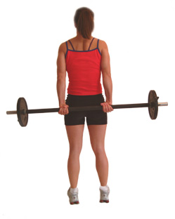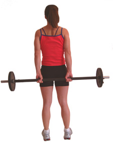 Stand straight with a barbell grasped behind your back, with your palms facing backwards at shoulder width apart.