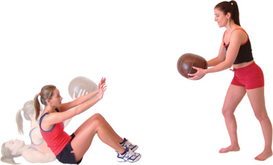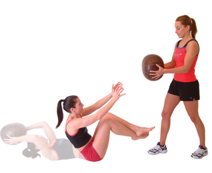 Position yourself close to your partner, h olding a suitable sized medicine ball at chest level (easier) or behind your head at the starting phase of the exercise.
