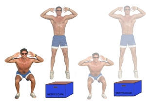 Facing forward throughout the movement, jump from one box, down to the ground, then up again landing on the top of the next box, aiming to minimum contact with the ground.