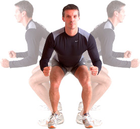 Keeping your feet slightly wider than shoulder width apart, and staying in the squatted position, jump 90 degrees from left to right, avoiding going around in circles.