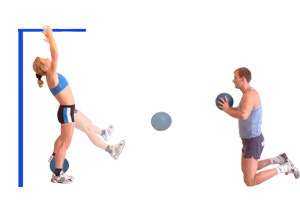 Stand with a suitable medicine ball grasped between your ankles, with your hands holding a secure object, ideally so that you are hanging a few inches off the ground.