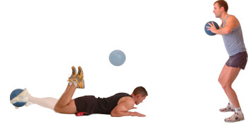 Lie on the floor grasping a light weight medicine ball between your feet, looking down towards the floor.