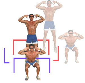 With your feet shoulder width apart, jump up and out of the formation, using your arms to aid both balance and upward lift.