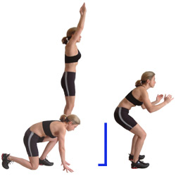 Upon landing, you may decide to lower down in order to repeat the movement, however aim to rest for a minimum of 20 - 30 seconds and repeat the action again, focusing on explosive height and distance.