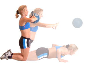 Aim to work with a partner who can pass the ball back to you in order to repeat the process. If performing on a hard surface, place some cushioned mats on the floor to protect your wrists upon landing.