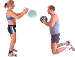 The exercise can be made harder by working in a kneeling position, keeping your abdominal and lower back muscles contracted to help absorb the impact and explosion of the ball.