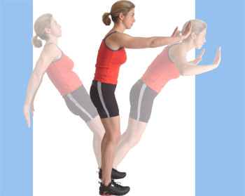 With yours arms extended behind you, palms parallel to the wall, lean backwards, using the wall to push yourself back up to your starting position.