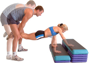This exercise can be made harder by actually walking up some steps or step boxes, taking care to make sure that your palms are placed fully on the step.