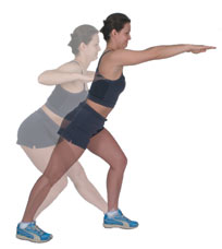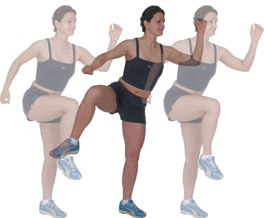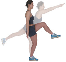 Rear Raise Extend the other leg straight back, whilst you lean forward, extending both arms out straight to head height. Bring your legs and arms back in together, taking your hands to your side, whilst taking the rear leg forward, bringing the knee high. Perform this movement 10 - 20 times each side. |