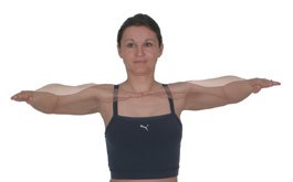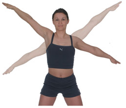 Chest Opener Arms Diagonally Extend both hands forward and back a few inches under control, adjusting the position of your hands, either palms facing down, forward or upwards. Repeat this movement 10 times on each side, then progress by taking both arms across the bodyline, finishing with the upper hand taken across then back down to your hip line. Breathe deeply throughout the motion, exhaling as you take your hands back in order to stretch your chest and biceps muscles. Work this action for 1 - 3 minutes. |