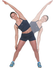 Side Bend Slide one hand down towards the knee of the same side, taking your other hand over your head, keeping your arm straight. Repeat the movement on the other side, aiming for 10 bends each side in 30 seconds. |